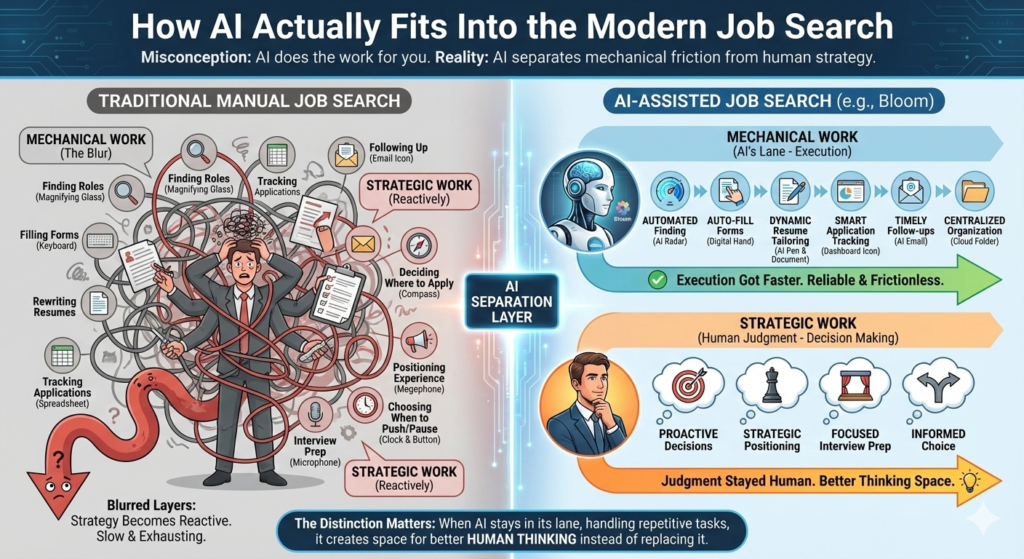 Manual job searches blur these layers. You spend so much time clicking, copying, and context-switching that strategy becomes reactive. AI-assisted workflows separate them.